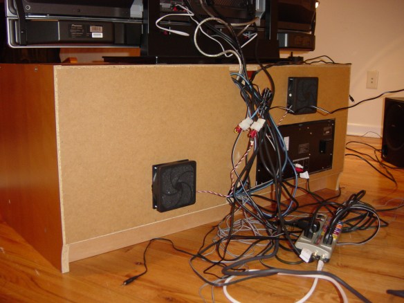Sony built the PS3 with one ostensible flaw: the motherboard was soldered using lead-free material. This kind of solder is purportedly more vulnerable than leaded solder to cracking in the presence of heat and the PS3 is no slouch when it comes to generating heat: its multiple cell processors and RSX GPU produce a great deal of thermal energy. I attempted to mitigate the heat problem in our compact entertainment center by installing two fans in the rear: one draws cool air in near the floor and the other pumps it back out near the top: